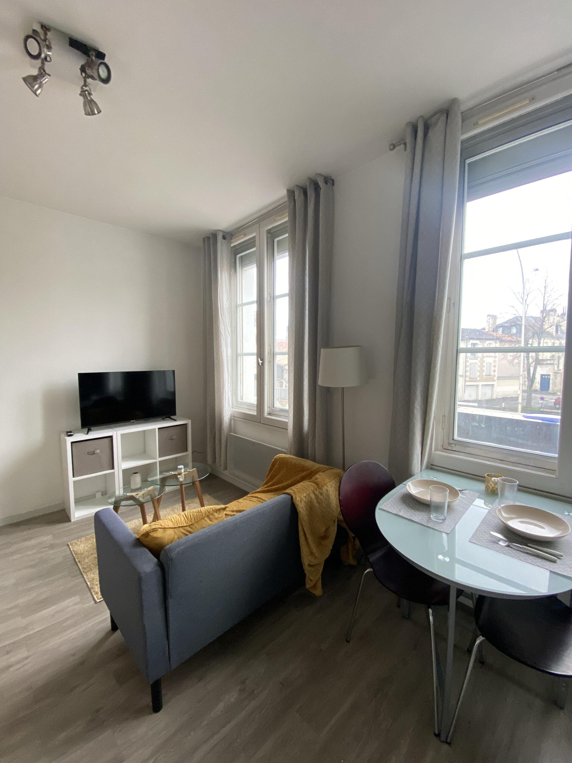 Studio meublé à louer à proximité directe de la gare et du centre-ville de Poitiers. Au premier étage d’un immeuble sécurisé, cet appartement est très lumineux.
