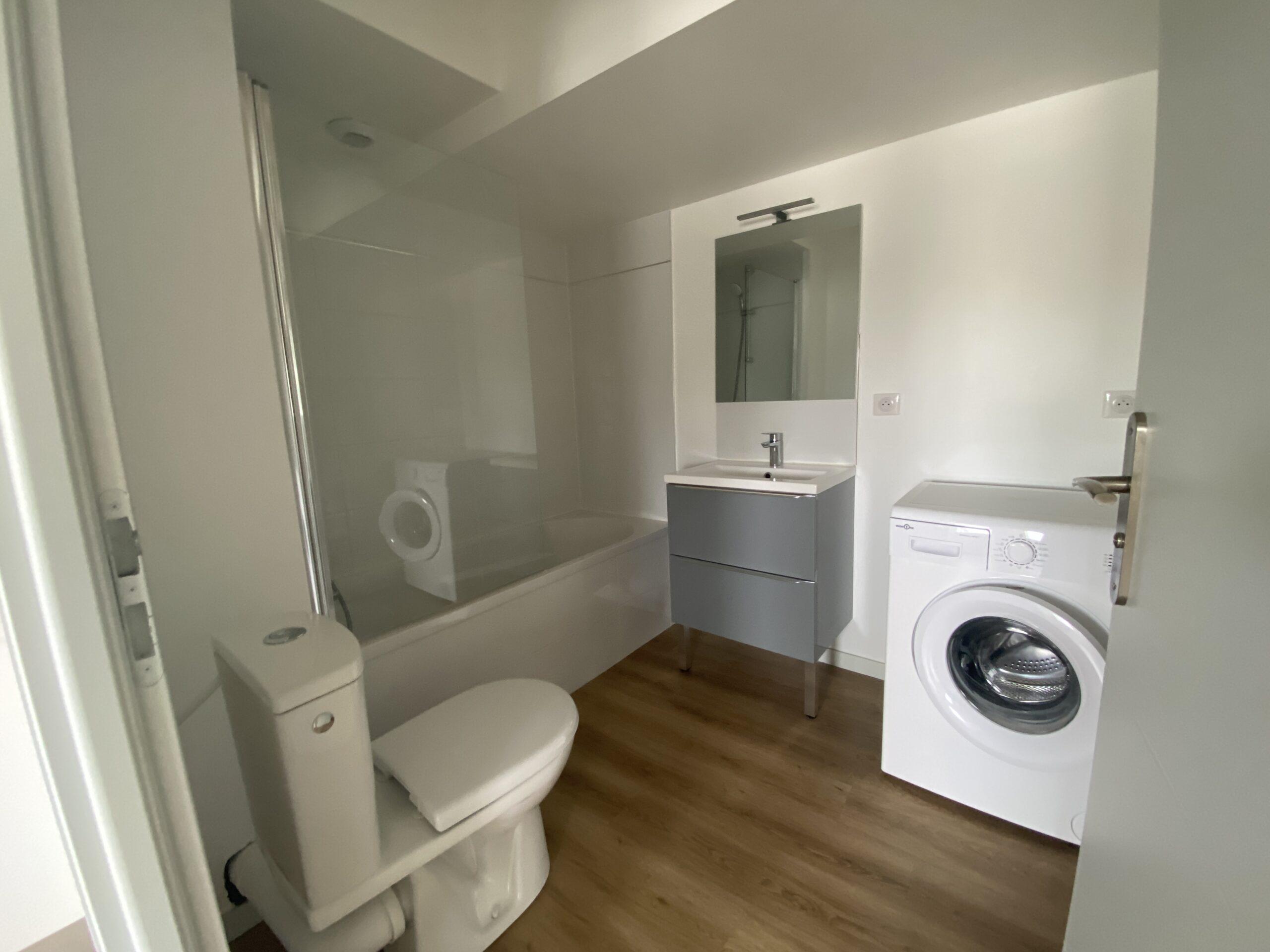 • une salle de bains avec vasque, rangements, sèche-serviette, machine à laver et WC