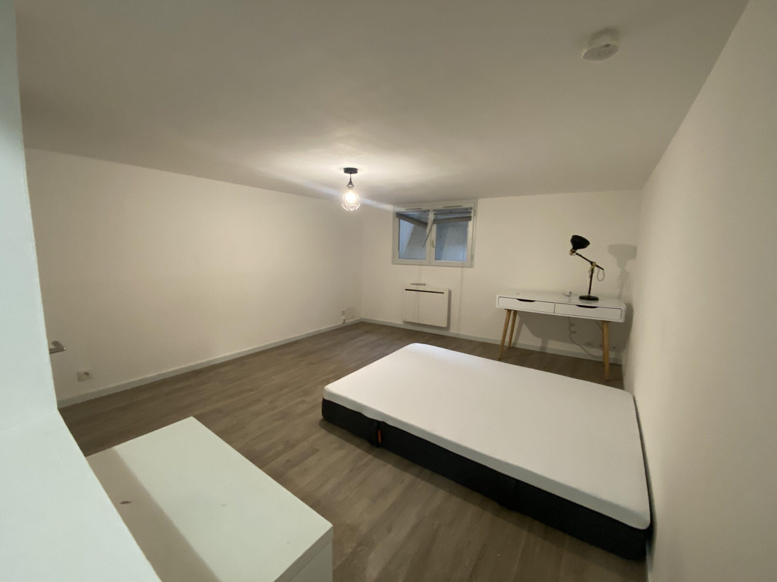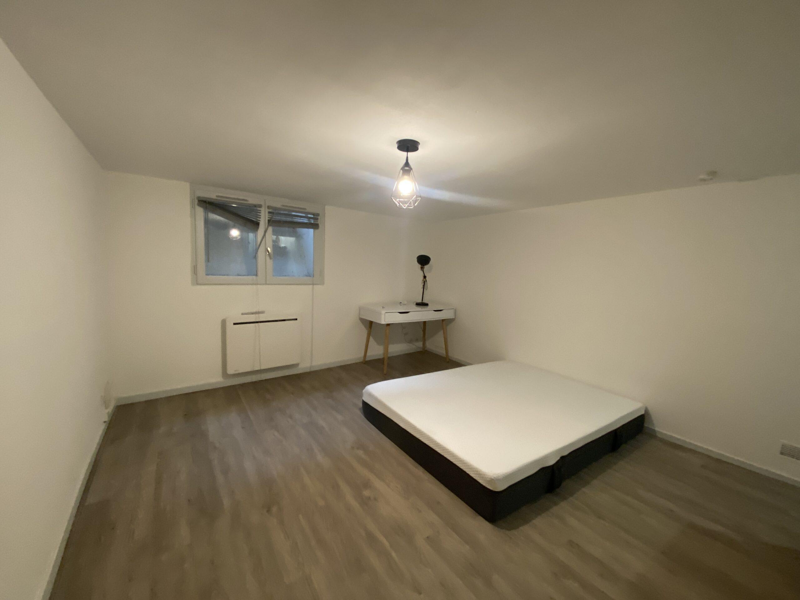 • une chambre en sous-sol avec matelas et sommier, bureau, rangements