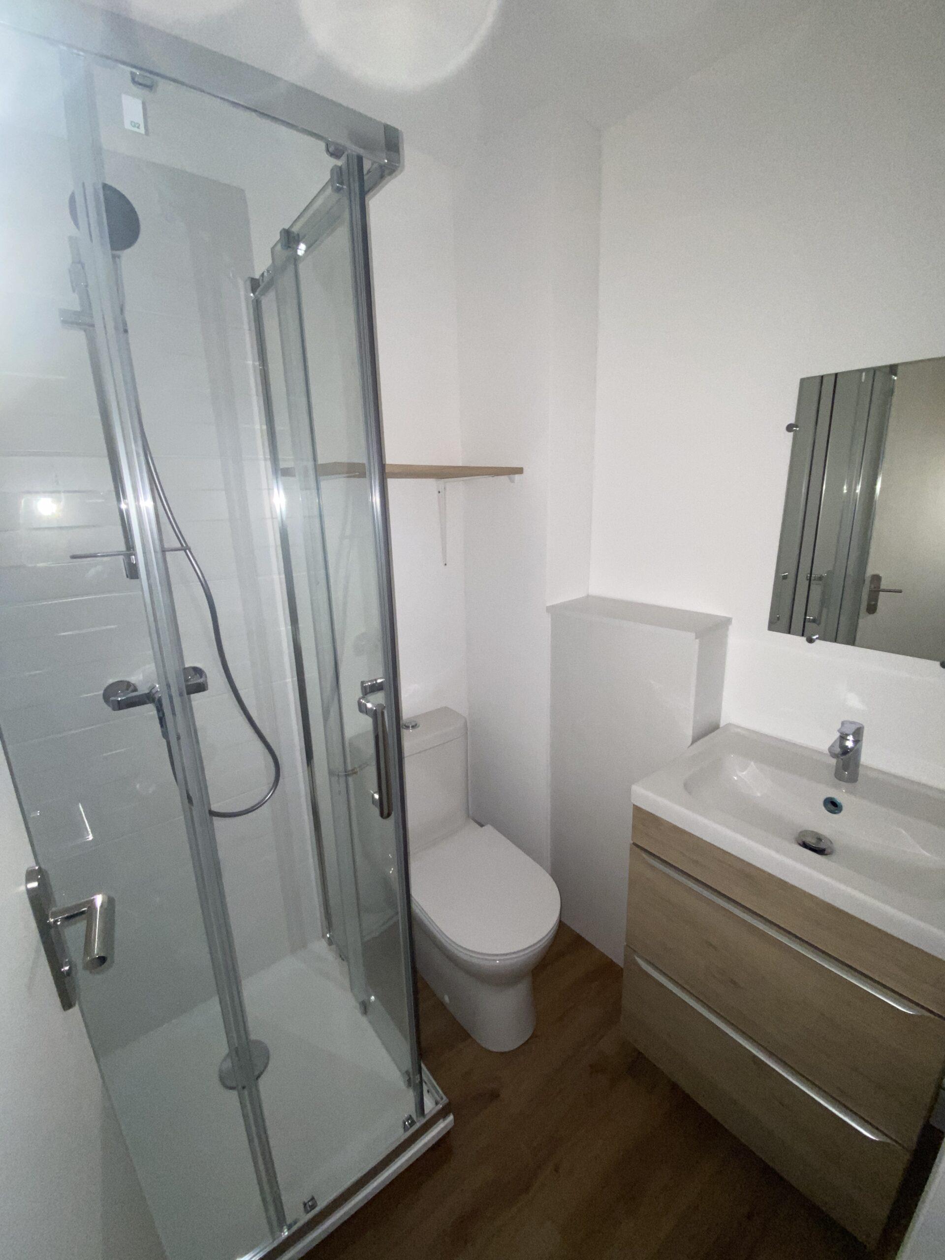 • une salle d’eau avec douche, meuble vasque avec miroir, rangements et WC