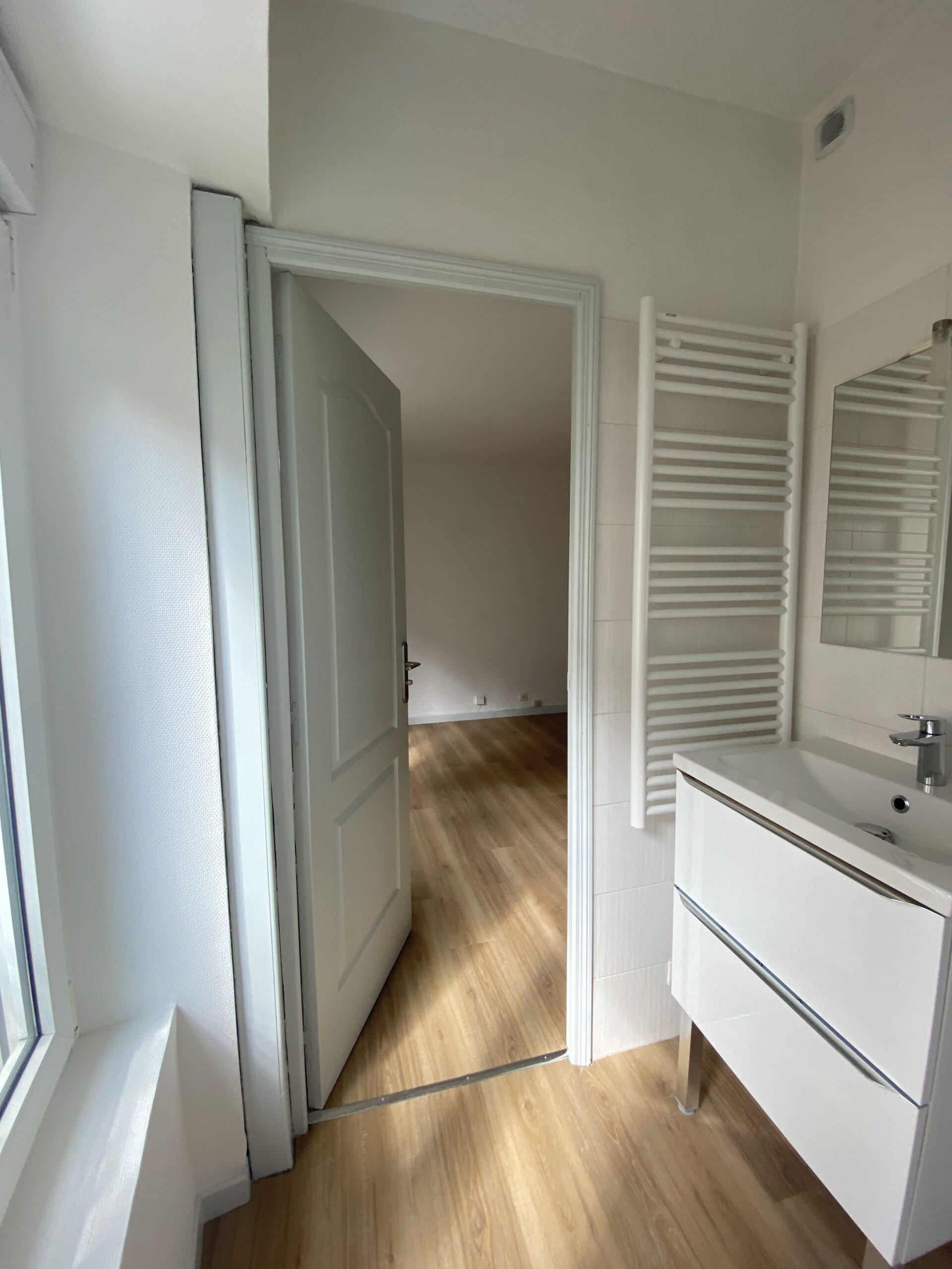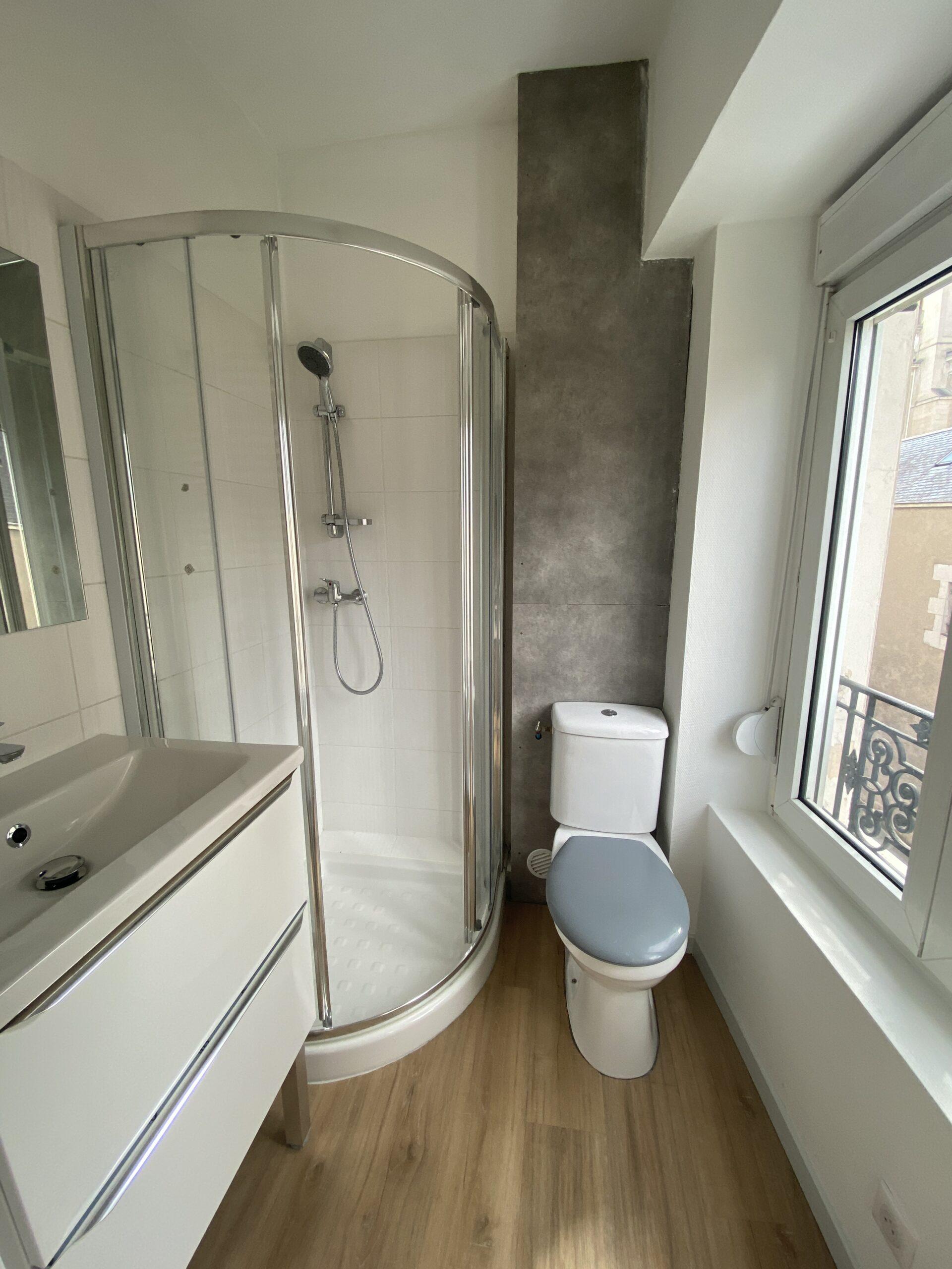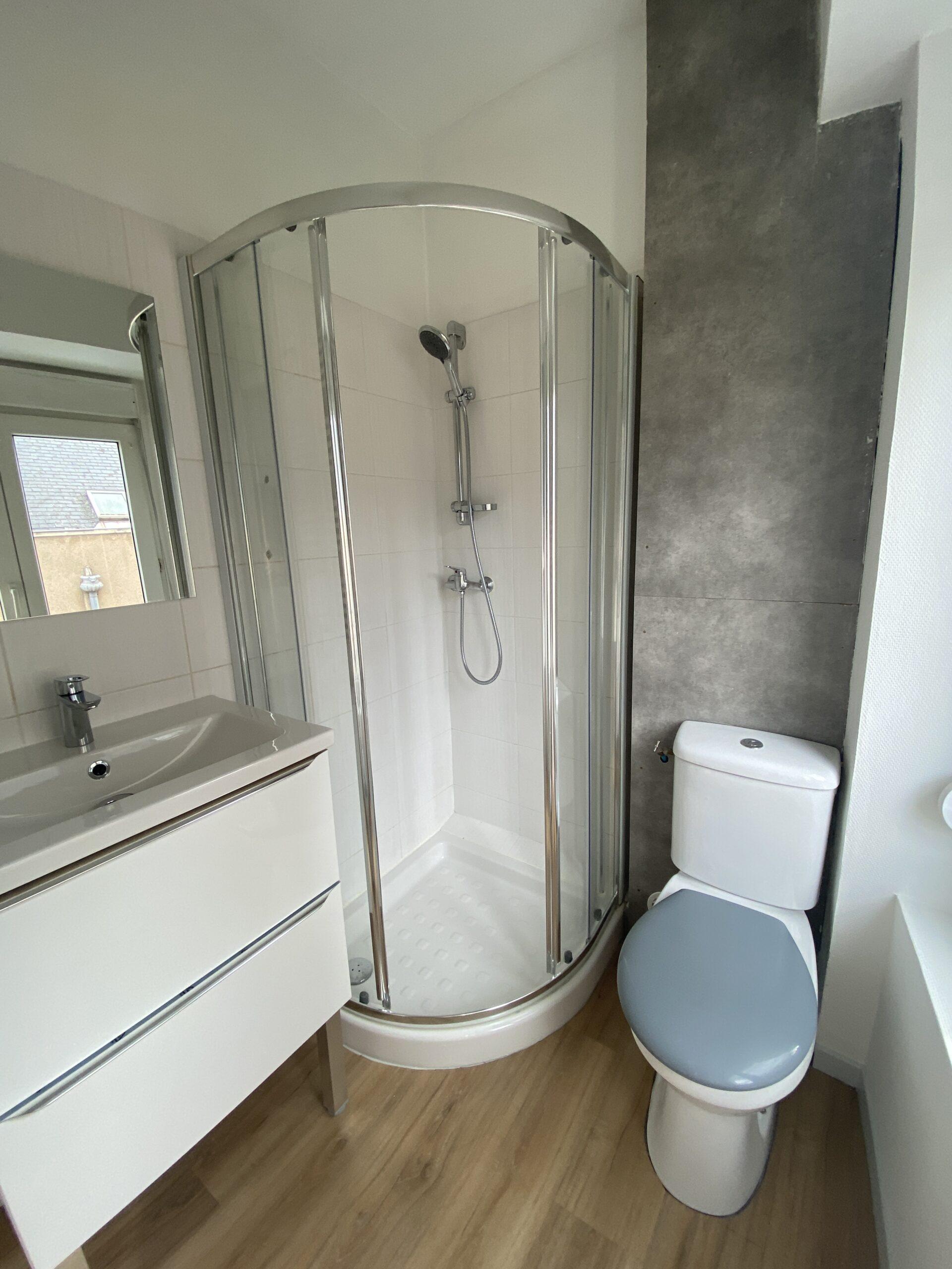 • une salle d’eau lumineuse avec WC, meubles vasque et miroir