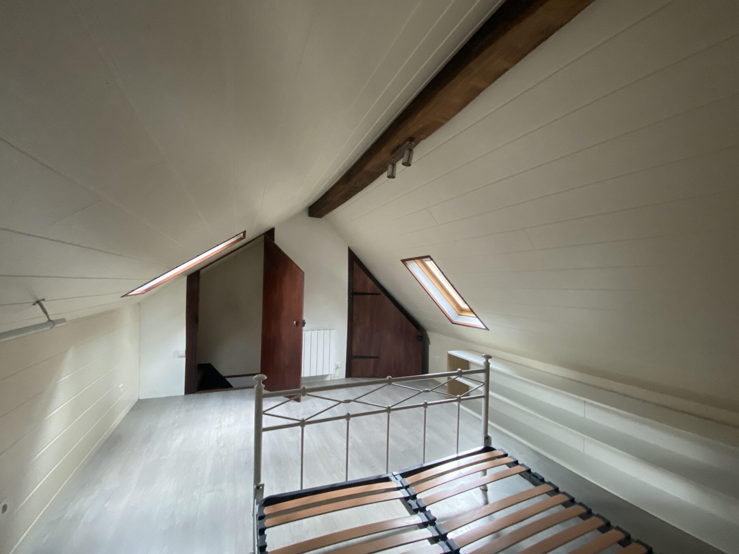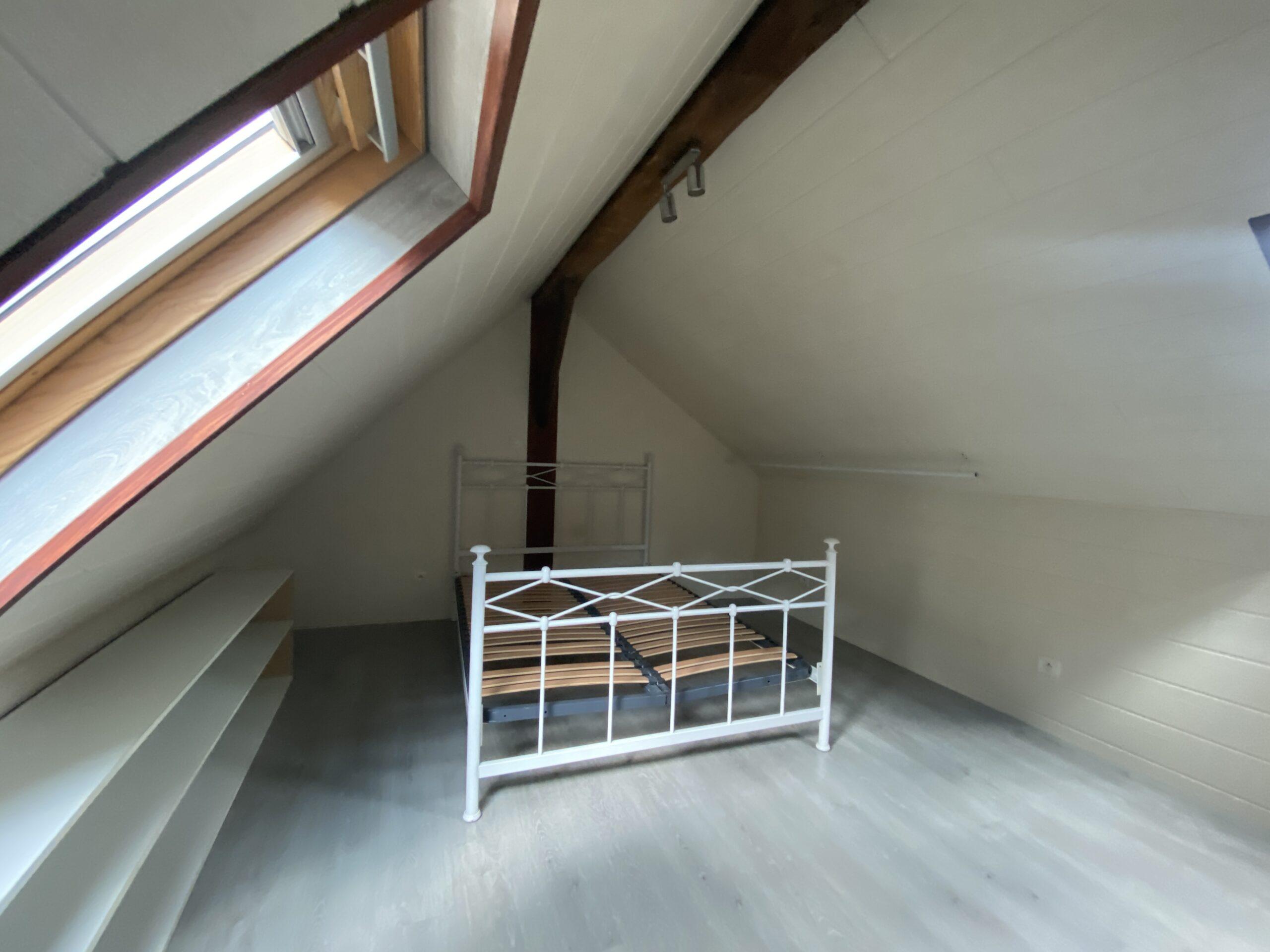 • une chambre spacieuse sous-les toits à l’étage avec un lit